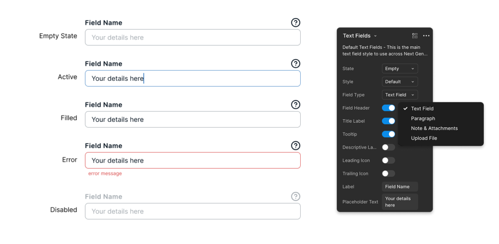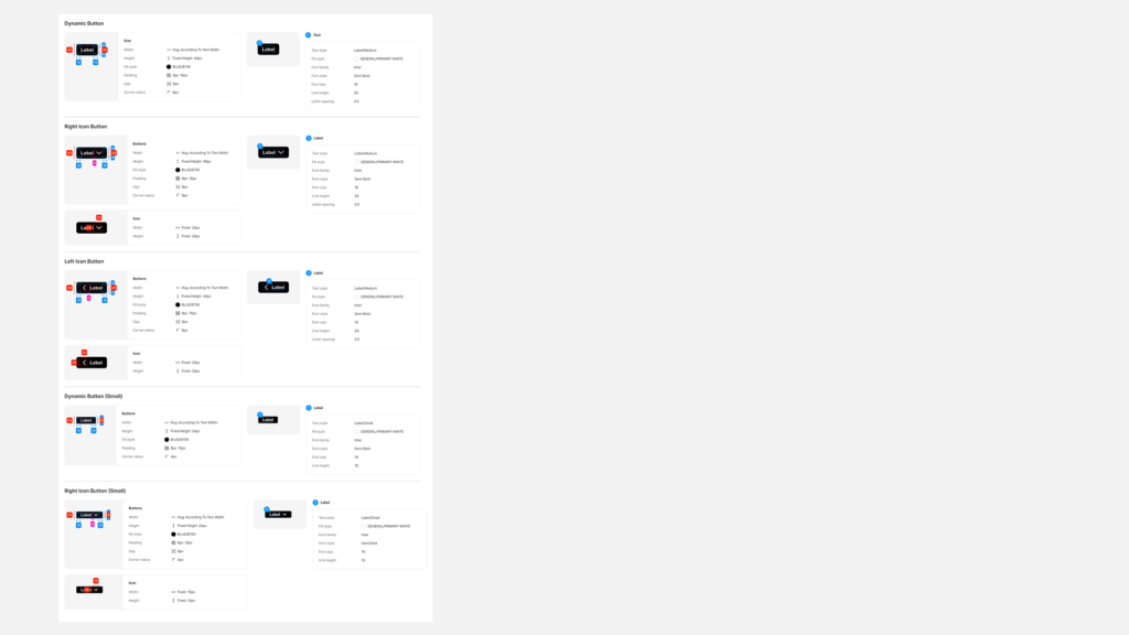 Design components are structured within the Figma Master Component library, starting with design specs and guideline on system usage. The final section includes documenting additional information in supporting information such as wireframes etc. This design system will be maintain and updated from time to time in order to cater new design components.